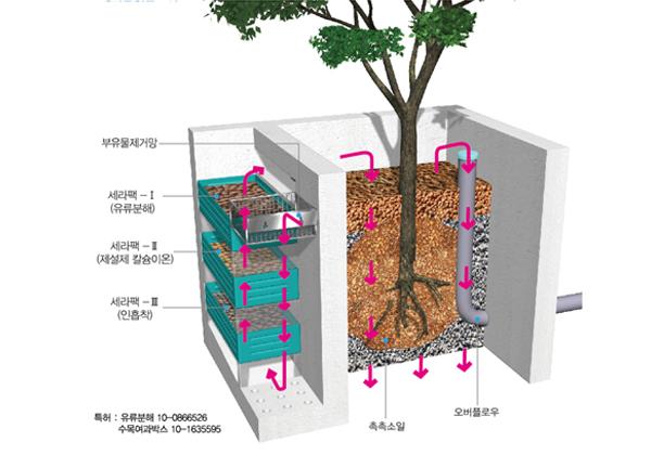 나무 또는 큰 관목이 식재된 박스를 매립하여 전단부 여과조에서 유류분해·인흡착 기능과 식재부의 촉촉소일이 중금속을 흡착하여 강우유출수에 포함된 오염물질을 저감시키는 시설